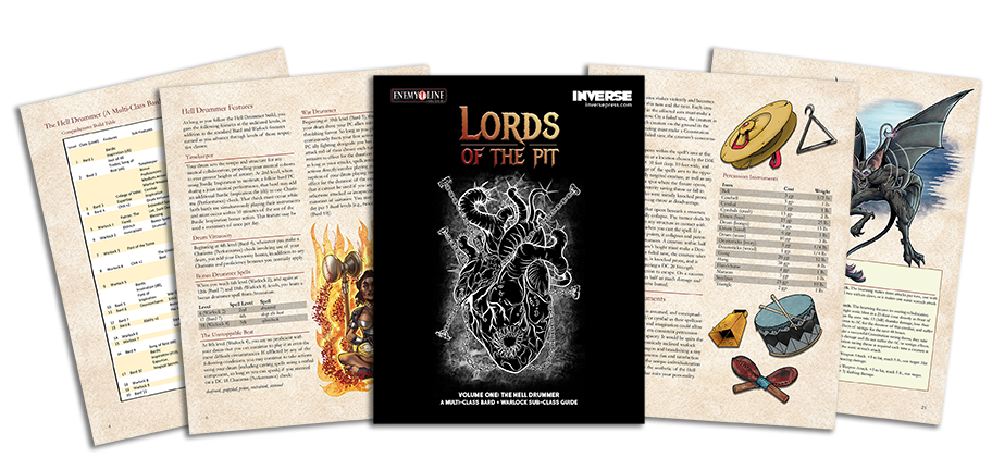 Lords of the Pit Volume One: The Hell Drummer is a 24-page, comprehensive guide to using the 5E multi-classing rules to build a kit-bashing weapon of mass destruction by weaving together the Bard and Warlock classes. The Hell Drummer sub-class guide includes: