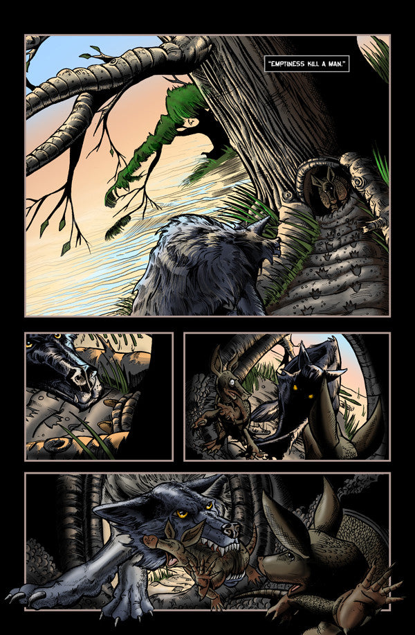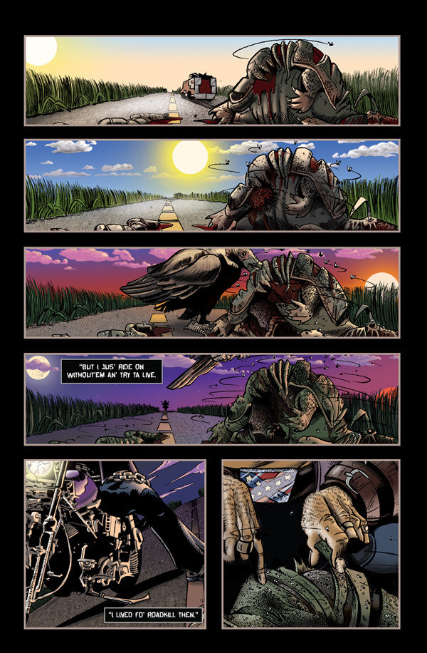 Witness the awful plight of a devastated biker afflicted with the curse to eat only that which dies on the road…and to then assume the traits of the very creature which he consumed. This biker, duJour, longs to recover the soul of his lost wife and gain vengeance against the voodoo witch who hexed him and murdered his gang. In this last chapter, the end of the road looms for duJour and the ragged remains of the Roadkill Motorcycle Club, as they finally confront Mama Houdoo in their quest for vengeance against her! But, first, secrets revealed may consume them all...
